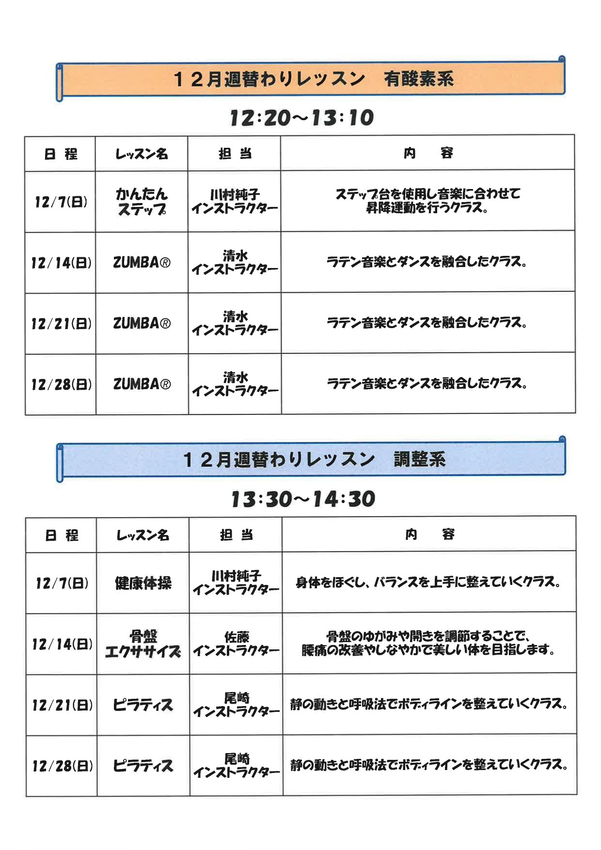 スタジオ週替わりレッスンの12月のスケジュールのお知らせです。