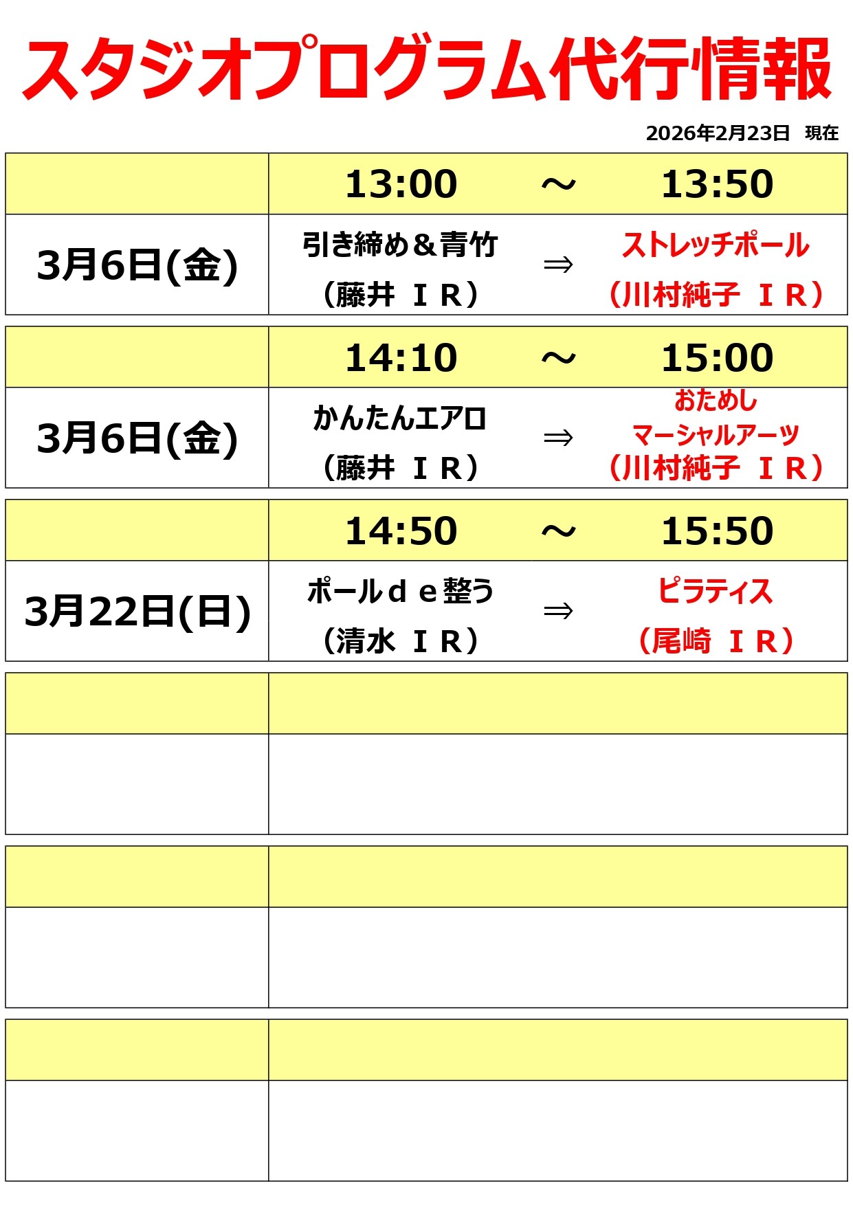 【追加】スタジオ週替わりレッスンのスケジュールのお知らせ(2026年3月分)