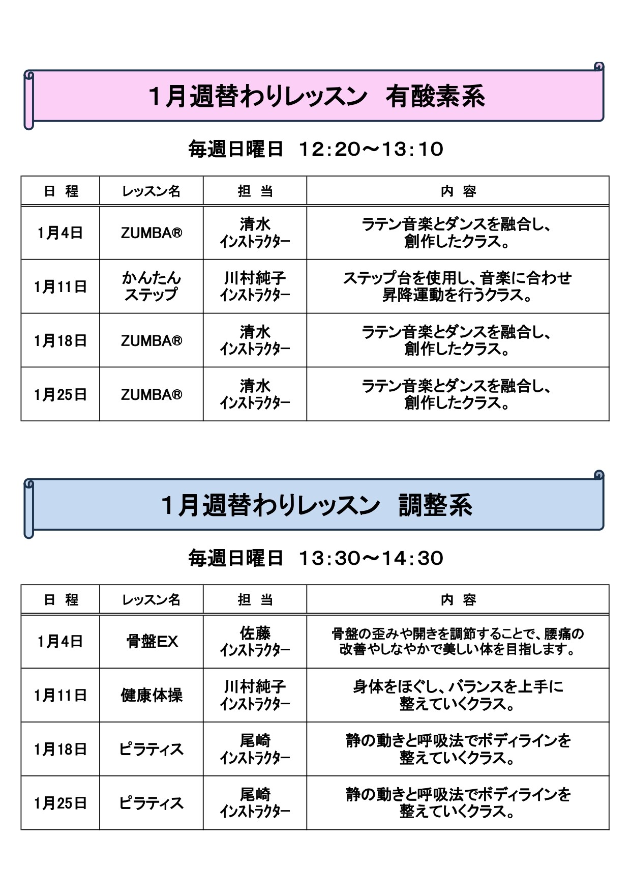 2026年1月のスタジオ週替わりレッスンのスケジュールのお知らせです。