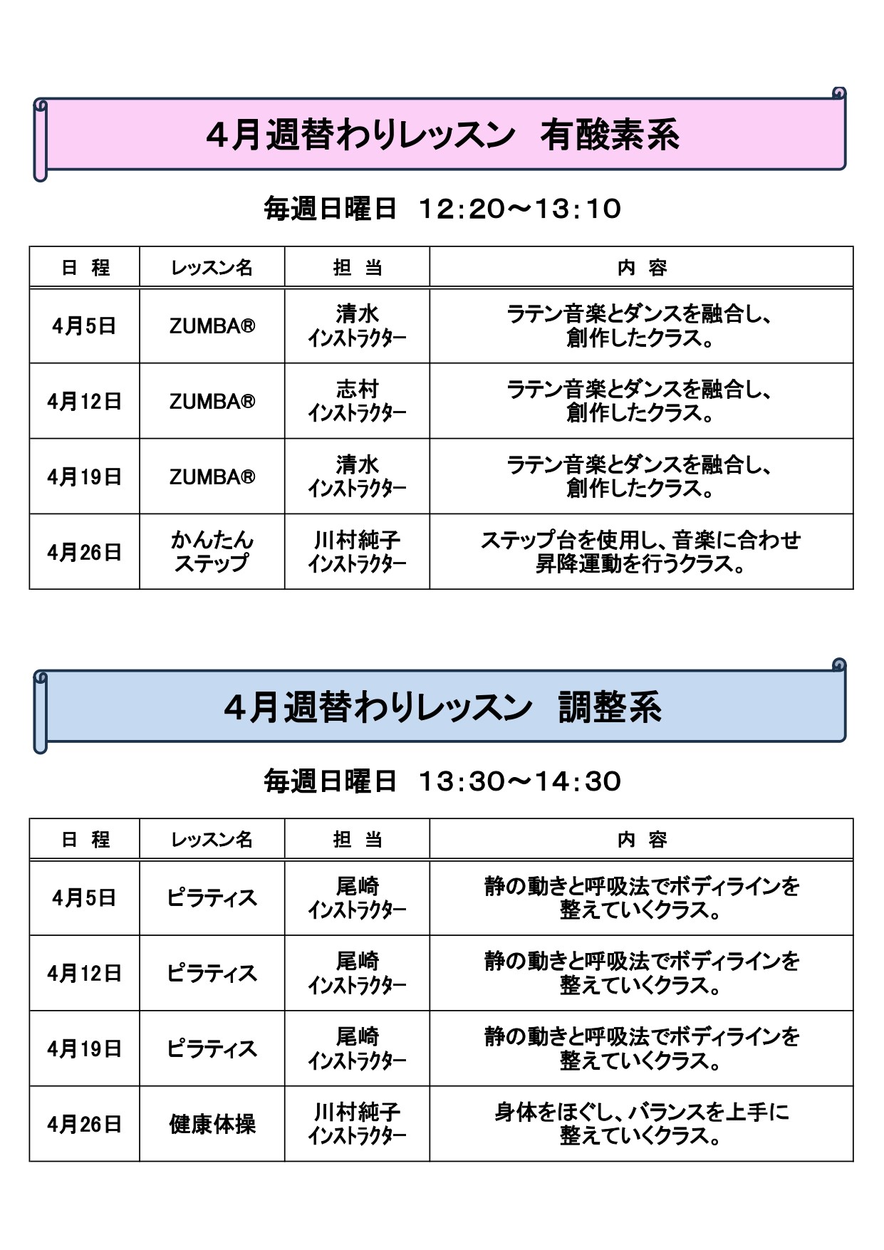 スタジオ週替わりレッスンの4月のスケジュールのお知らせです。