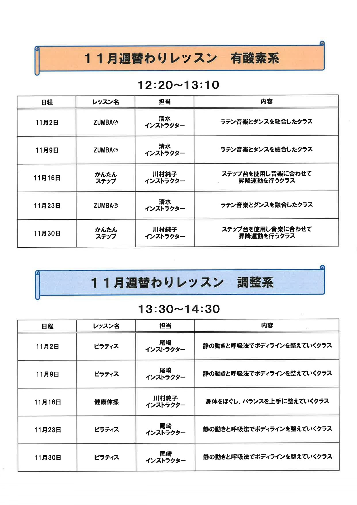 スタジオ週替わりレッスンの11月のスケジュールのお知らせです。